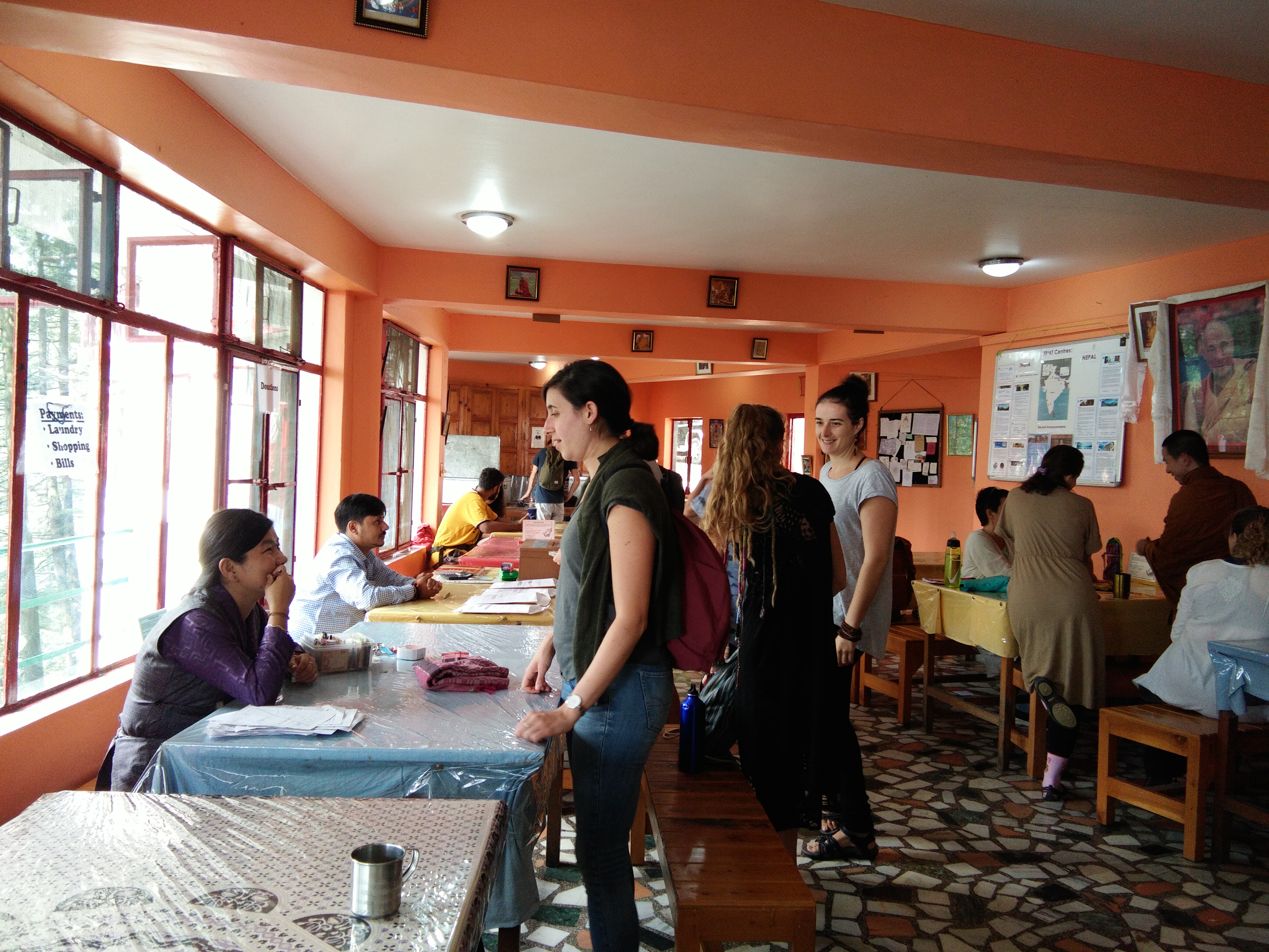 A glimpse of check-out day. Check-in day was similar. Multiple tables for different tasks such as room allocation, assigning of karma yoga jobs etc